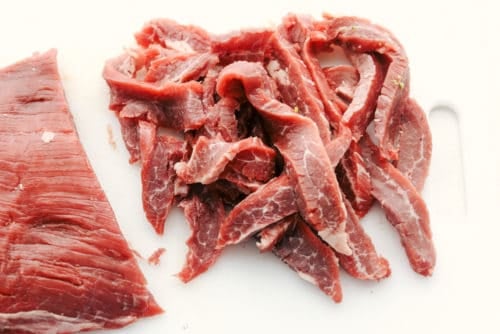 - Cut the flank steak across the grain in 1/4 inch strips.