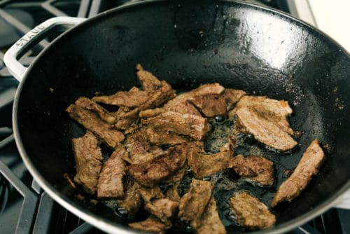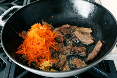 - Cook steak: While the pasta is cooking, add olive oil to a medium sized skillet. Cook the steak until no longer pink. Add the garlic, and carrots and cook for a minute more.