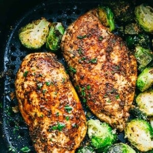 - Air Fry: Place the chicken in the air fryer basket. Cook at 360 degrees Fahrenheit for 9 minutes. Flip the chicken and add Brussels sprouts, if using. Cook for an additional 9 minutes or until the internal temperature is 165 degrees Fahrenheit. Allow the tender chicken to rest for 5 minutes before slicing and enjoying!