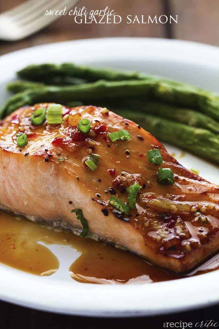 Juicy, tender brown sugar garlic salmon served with asparagus and lemon wedges.