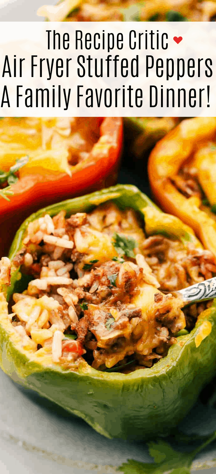 A super easy and delicious dinner begins here with Air Fryer Stuffed Peppers. Filled with a savory mixture and cooked to tender perfection, it is going to be a family favorite!