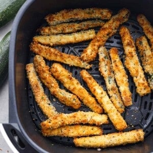 Air fryer zucchini fries are a low-carb, keto-friendly snack that’s ready in minutes! Crispy and cheesy on the outside, tender on the inside, this is the best way to use up your leftover summer zucchini.