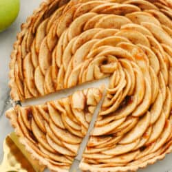 I, personally, like the way this tart tastes more than an apple pie. It’s beautiful, too! You are able to get neat, crisp slices without globs of apple filling spilling out. This apple tart is light and delicious when eaten on its own, but is also amazing a la mode with a scoop of homemade ice cream on top. Fresh whipped cream or crème fraîche taste great as toppings as well. I know you are going to love this tart as much as I do! It just takes a little prep and arranging of apple slices to create a tasty, lavish dessert. Honestly, putting this tart together is one of my favorite parts of this whole process. It’s so fun to see something beautiful come together!