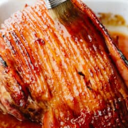 - Brush on glaze: Brush 1/2 of the glaze over the ham. Make sure the glaze gets between the slices.