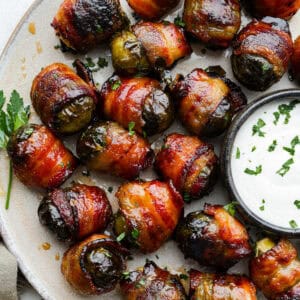 • Bake for 30 minutes, flipping them halfway through, until the bacon is crisp and the Brussels sprouts are tender. Remove immediately from the baking sheet and place them on a serving dish. Serve warm with your favorite creamy dip.