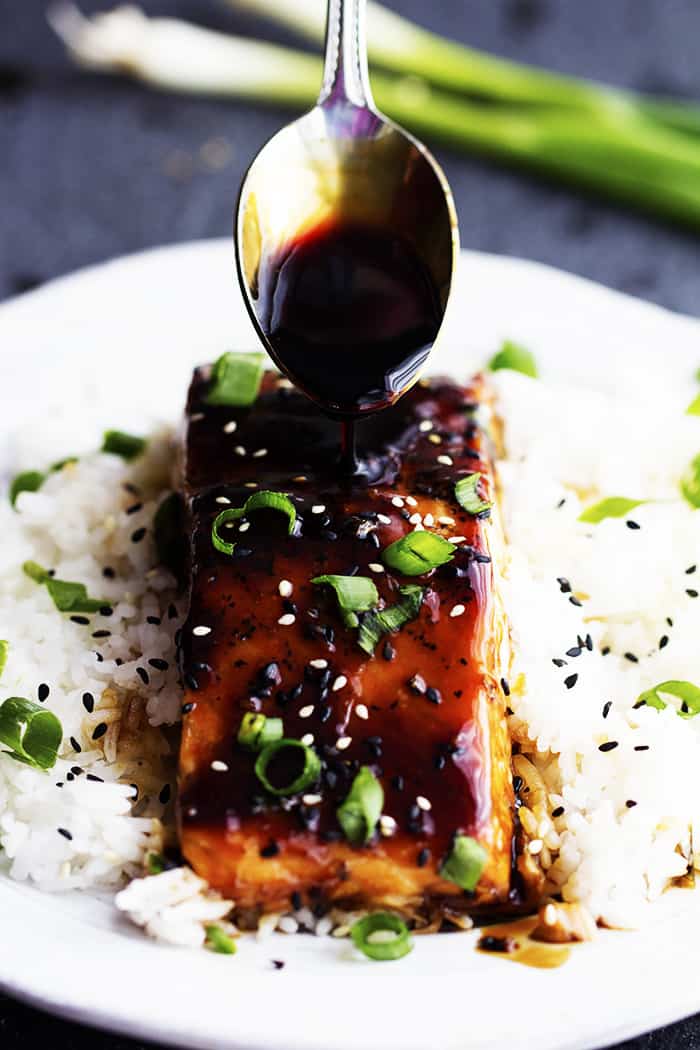 - Brush the top of the salmon with the reserved ¼ cup of sauce. Garnish with thinly sliced green onions and sesame seeds. Serve immediately with rice.
