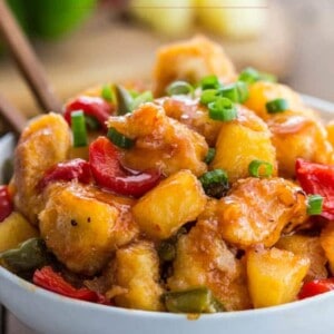 Someone asked me the other day what my favorite recipe from my blog was. It is always hard to choose a favorite! Especially when I have so many good ones. But my mind always goes to the Baked Sweet and Sour Chicken. Chinese food is one of my favorite things! And this is so close to tasting straight from a restaurant. This gets RAVE reviews and I am always getting comments like, “My husband was checking the trash for take out boxes because he wouldn’t believe me that I made it!” And that pretty much sums everything about this recipe. The texture of the chicken is perfect and the sauce glazed on top is amazing.