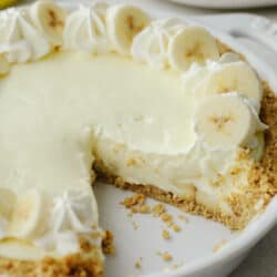 Banana cream cheesecake is one of my favorite desserts! It has a graham cracker crust and a perfectly creamy filling. Top it with some whipped cream and fresh bananas, and you won’t be able to stop!