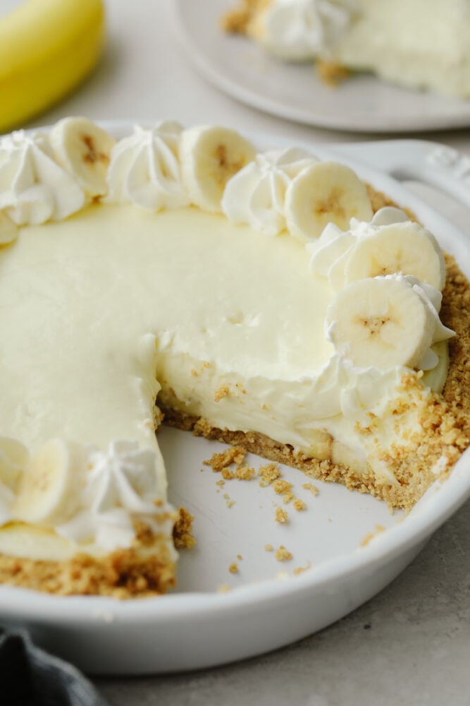 Banana cream cheesecake in a pie pan with a slice taken out.