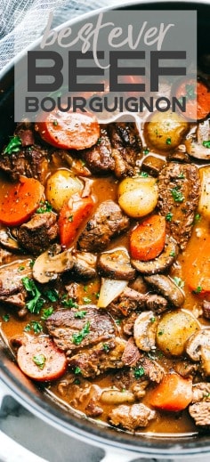 After my Slow Cooker Beef Bourguignon went crazy viral, I knew that I wanted to show you how to make it on the stove and in the oven. If you are looking for more hearty beef stew recipes, be sure to also try Beef Stew with Bacon, Vegetable Beef Soup, or this Slow Cooker Beef Stew.