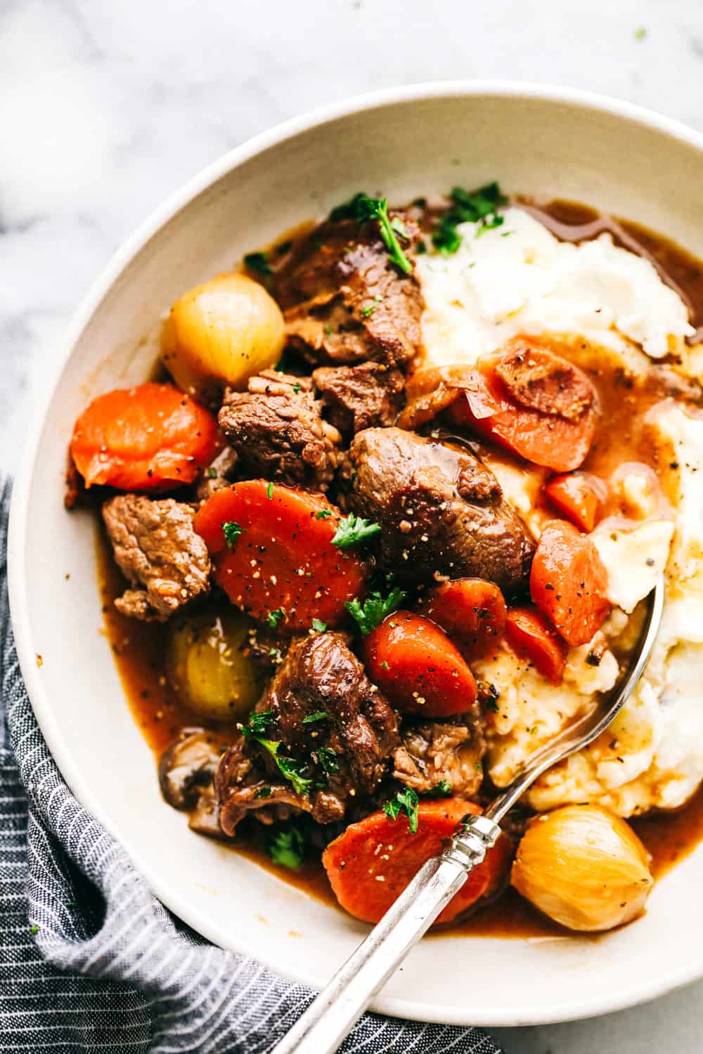 Beef Bourguignon is a French classic made with melt in your mouth beef, mushrooms, carrots, and red wine and is cooked to perfection in the most delicious rich sauce. A hearty and comforting meal that you will make again and again!