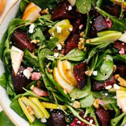 This beet salad is so fresh and tantalizing, it’s one of the most delectable ways to eat roasted beets. The crunchy sweet pears couple perfectly with the earthy sweet beets. Roasted walnuts add crunch and flavor. The salty feta is incredible with the honey vinaigrette. All of this sits perfectly balanced on a bed of spinach and mixed greens I love the arugula mix. It has a nice peppery bite to it that is just awesome. It’s the perfect fall and winter salad. You and your family are going to love this.