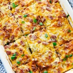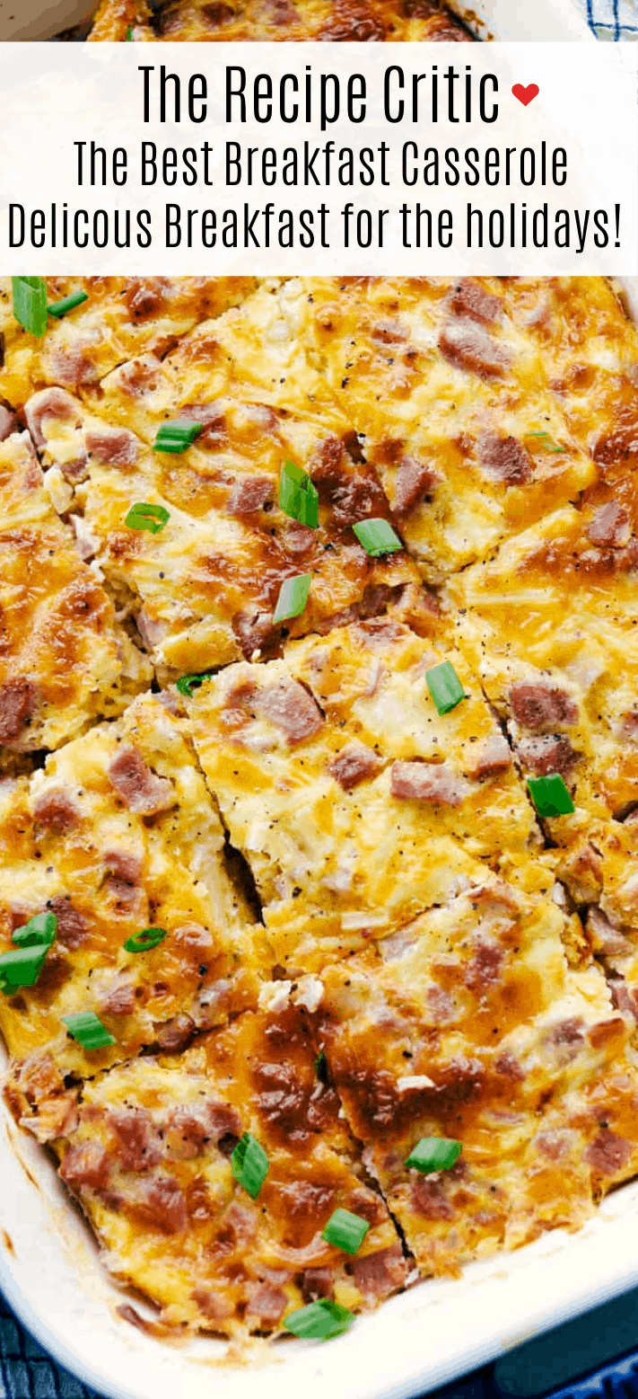 This is truly the BEST Breakfast Casserole! It has a thick and creamy egg base loaded with potatoes, ham, and a flavorful cheese blends that bake up in no time.