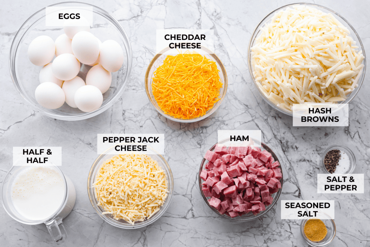 • In a large bowl, whisk together 12 large eggs. Add 2 cups half and half and 1 teaspoon seasoned salt, then whisk to combine. Stir in 1 ½ cups shredded cheddar cheese, 1 ½ cups shredded pepper jack cheese, and 2 cups chopped ham.