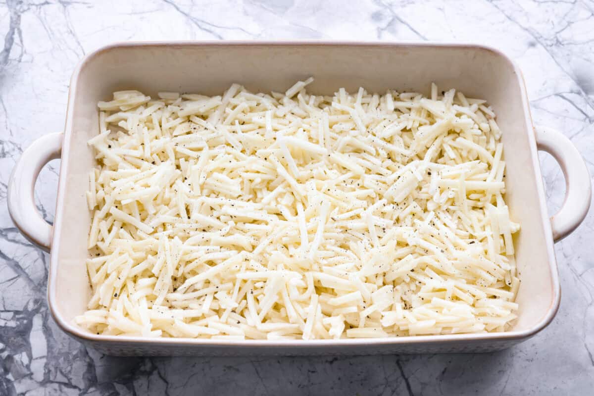 1. Prepare Frozen Hash Browns: Spray a 13 x 9 x 2-inch baking dish with non-stick cooking spray. Add the frozen shredded hash browns to the bottom of the prepared pan. Season with salt and pepper.