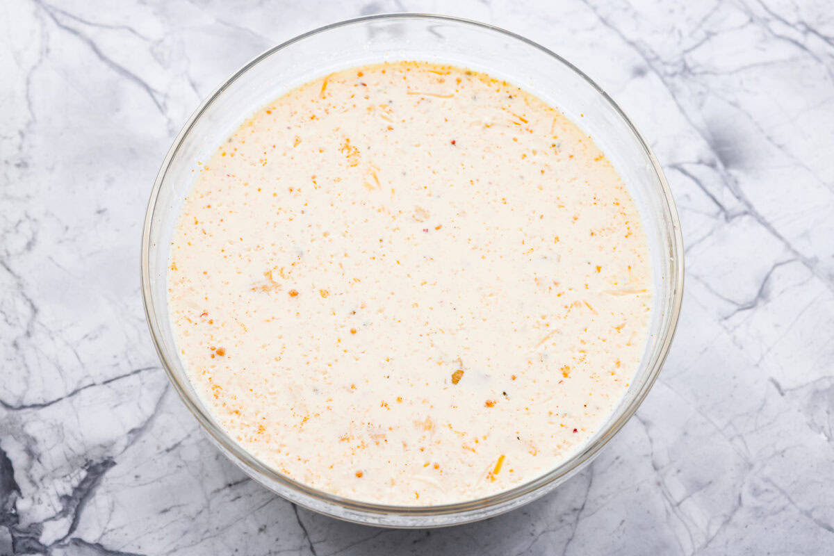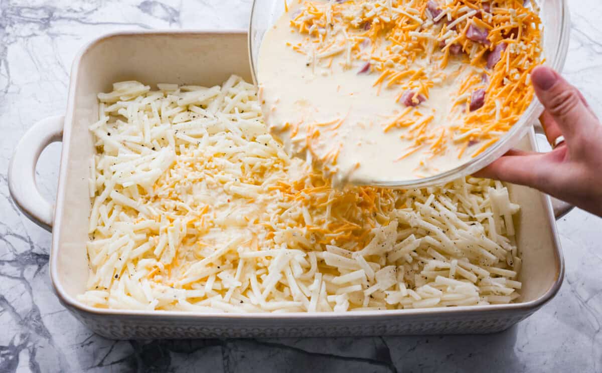 3. Pour Into Pan and Refrigerate: Pour over the top of the frozen hash browns, then cover with foil and refrigerate for 2 hours or overnight.