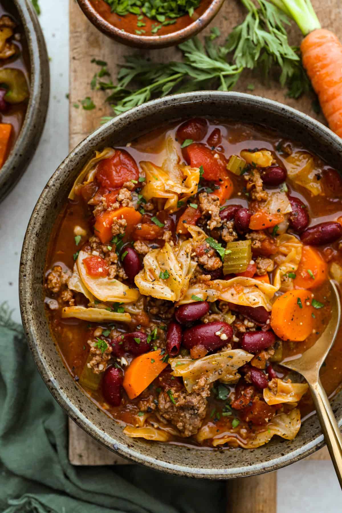 - Add ½ chopped head cabbage, 1 (28-ounce) can diced tomatoes, 2 stalks chopped celery, 2 medium peeled and chopped carrots, 1 (16-ounce) can kidney beans, 3 ½ cups beef broth, and 1 tablespoon Italian seasoning. Stir to combine.