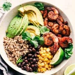 Blackened Shrimp Avocado Burrito Bowls are the perfect way to ring in the New Year with big bold flavor and a healthy meal! These are packed with blackened shrimp, brown rice, corn, black beans, and avocado. They are also great for meal prep!