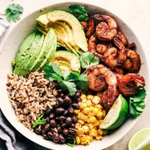 - To assemble the bowls, divide the shrimp, 1 (15.25 ounce) can corn, 1 (15.25 ounce) can black beans, 2 cups cooked brown rice, and 2 sliced avocados evenly. If using for meal prep, add the avocado right before eating. Drizzle with dressing.