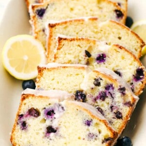 Blueberry Lemon Pound Cake is a pound cake made lighter by using greek yogurt, and is loaded up with lemon flavor thanks to zest and fresh lemon juice! Juicy blueberries are baked right in, then drizzled with a luscious lemon glaze.
