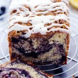 An amazingly moist muffin bread filled with blueberry pie filling. Topped with a crumb topping and drizzled in a lemon glaze this bread is incredible!