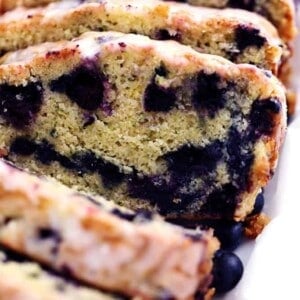 Blueberry Zucchini Bread with a Lemon Glaze will be one of the best quick breads you EVER make! Perfectly moist with two cups of zucchini hidden inside and bursting with fresh blueberries. The lemon glaze it the perfect finishing touch!
