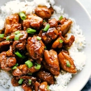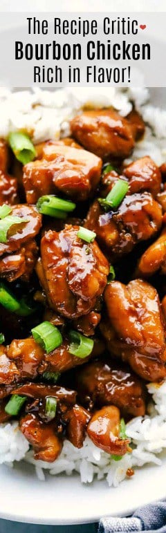 Bourbon Chicken is juicy, tender chicken thighs cut into pieces simmered in a sweet, brown sugar glaze that will melt in your mouth!