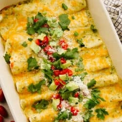 • Pour the enchilada sauce evenly over the enchiladas, and top with remaining shredded cheese. Bake for 25 minutes or until golden and bubbly. Garnish with avocado, green onion, diced tomatoes, and cilantro if desired.