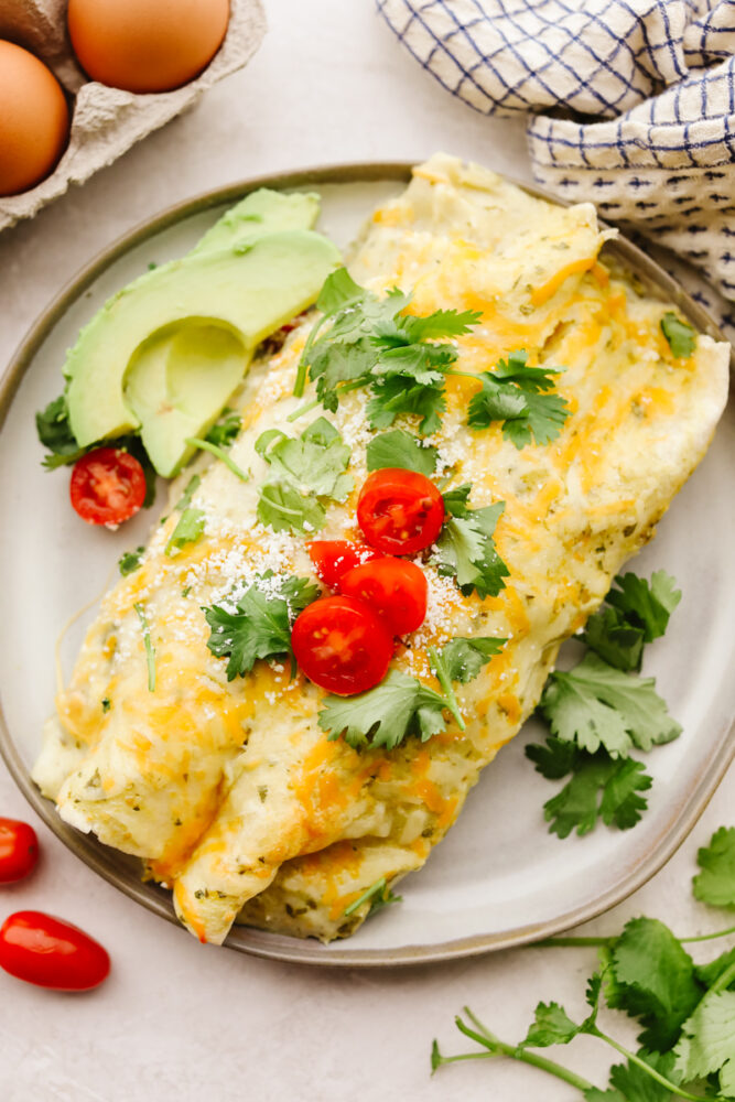 A plate with breakfast enchiladas garnished with cilantro, avocado and tomatoes.